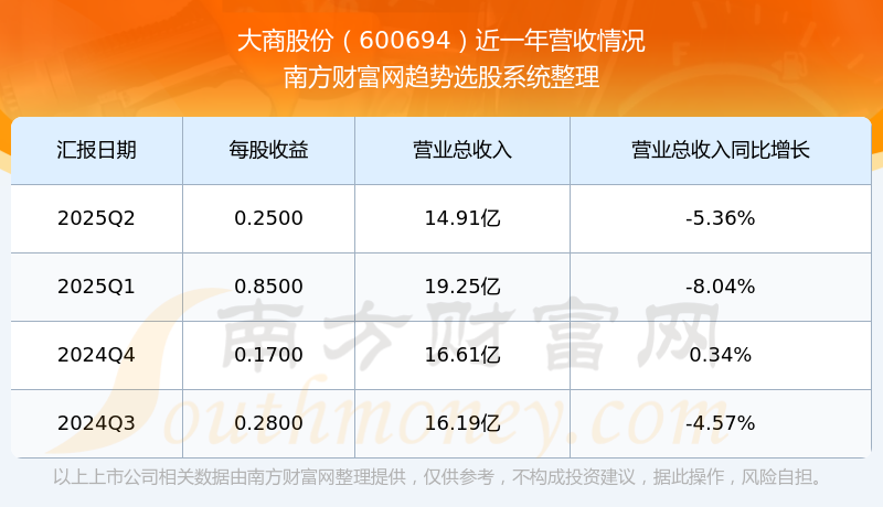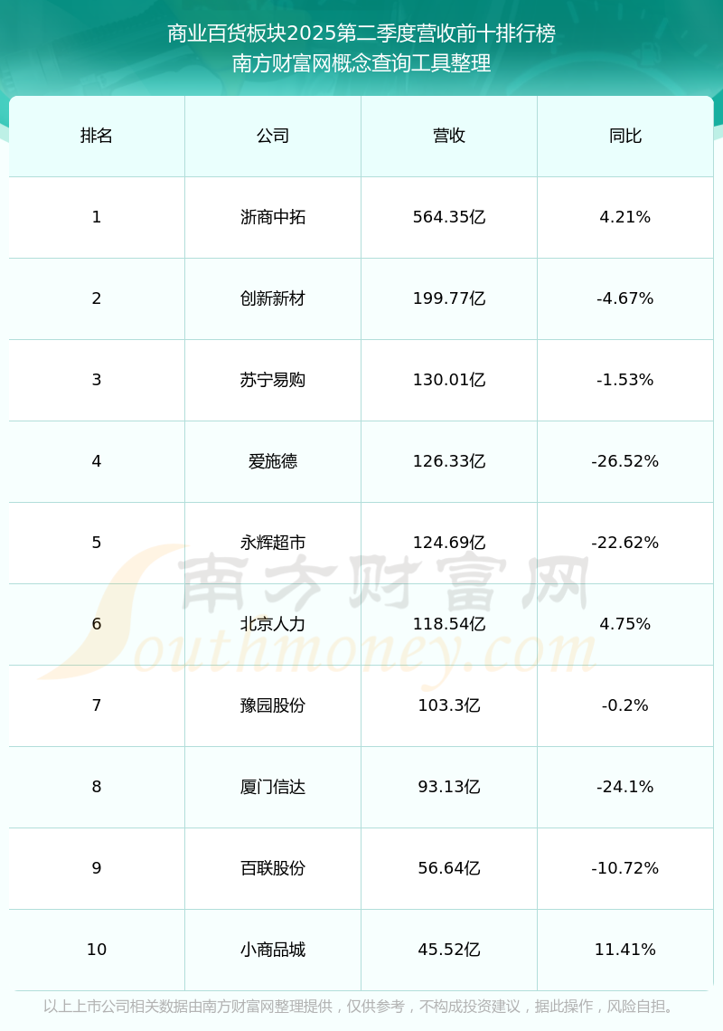 按照南方財富網(wǎng)概念查詢工具統(tǒng)計,該股所屬板塊為商業(yè)百貨板塊,該板塊共有75只股票,大商股份2025第二季度營收在該板塊中排名為第24名,該板塊2025第二季度營收排名前十的股票如下表: