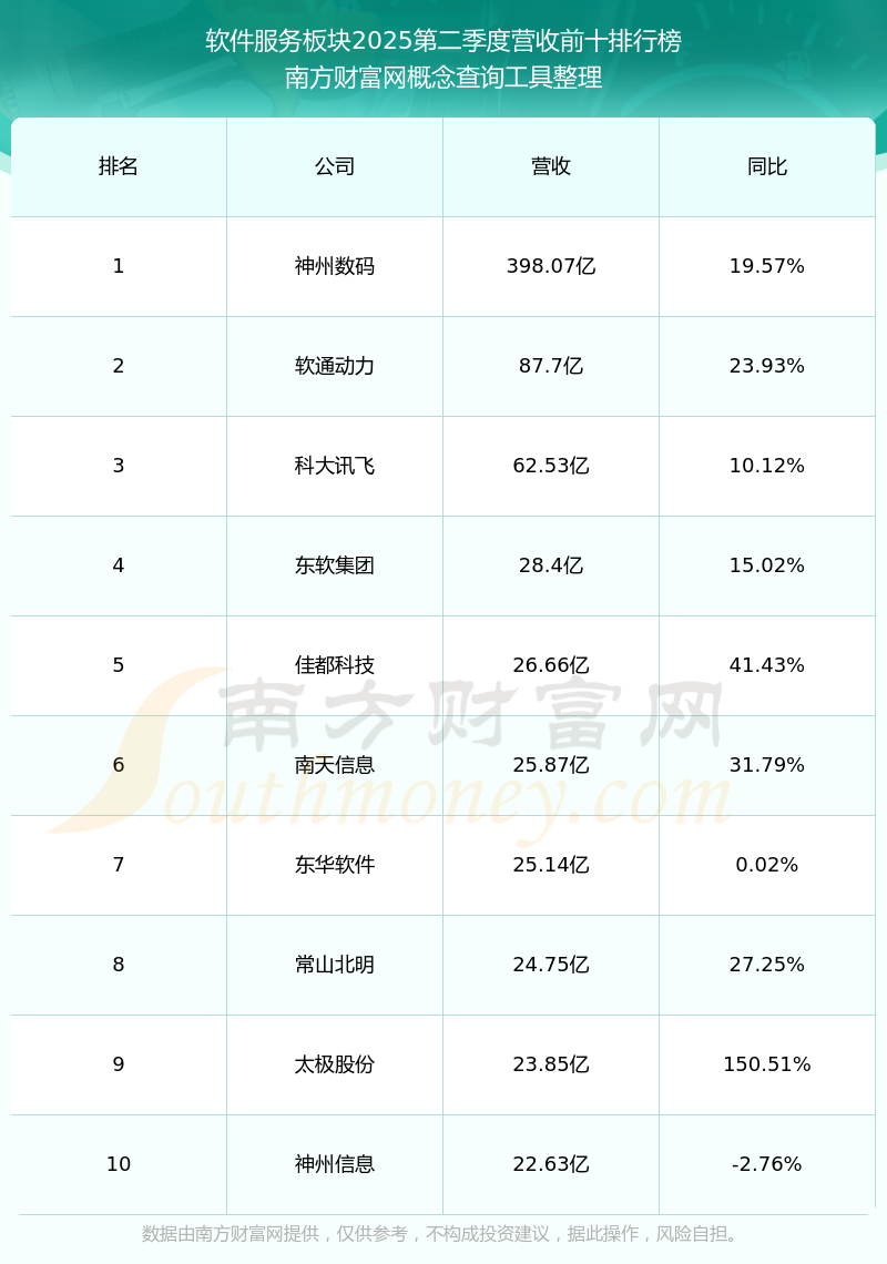 按照南方財(cái)富網(wǎng)概念查詢工具統(tǒng)計(jì),該股所屬板塊為軟件服務(wù)板塊,該板塊共有286只股票,寶蘭德2025第二季度營(yíng)收在該板塊中排名為第265名,該板塊2025第二季度營(yíng)收排名前十的股票如下表: