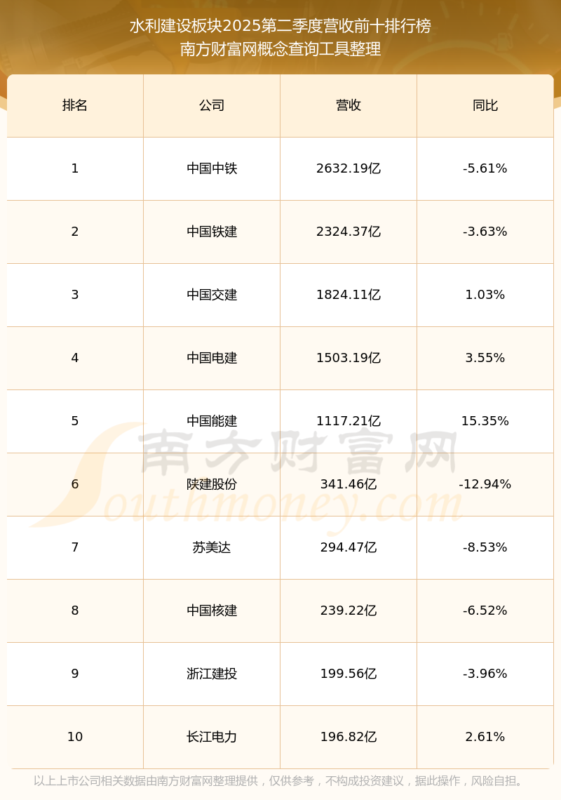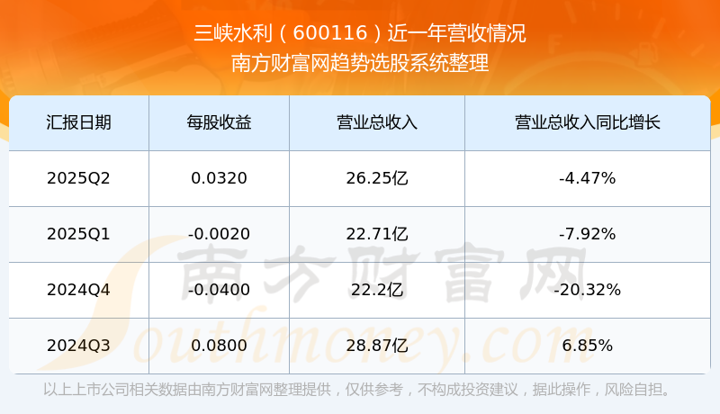 按照南方財富網(wǎng)概念查詢工具統(tǒng)計,該股所屬板塊為水利建設板塊,該板塊共有137只股票,三峽水利2025第二季度營收在該板塊中排名為第32名,該板塊2025第二季度營收排名前十的股票如下表: