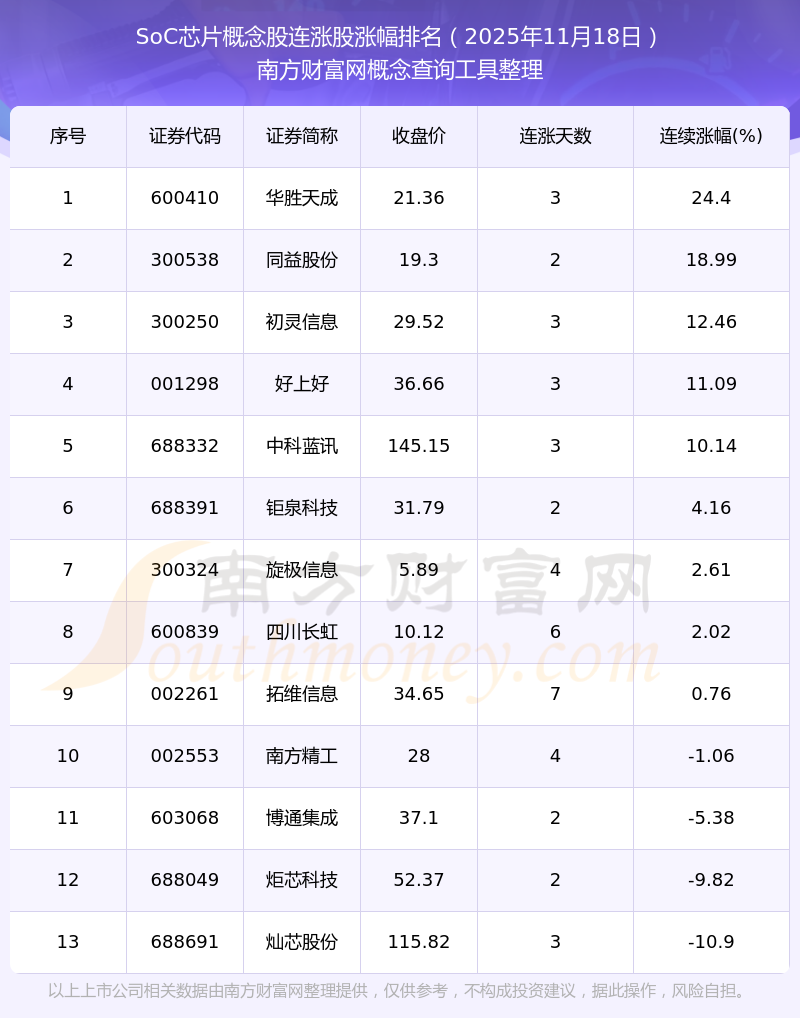 根據(jù)南方財(cái)富網(wǎng)概念查詢(xún)工具數(shù)據(jù)統(tǒng)計(jì),截止2025年11月18日收盤(pán),SoC芯片概念股共有13只個(gè)股實(shí)現(xiàn)連漲。其中連續(xù)漲幅較大的個(gè)股有華勝天成、同益股份、初靈信息等,連續(xù)漲幅分別為24.40%、18.99%、12.46%。