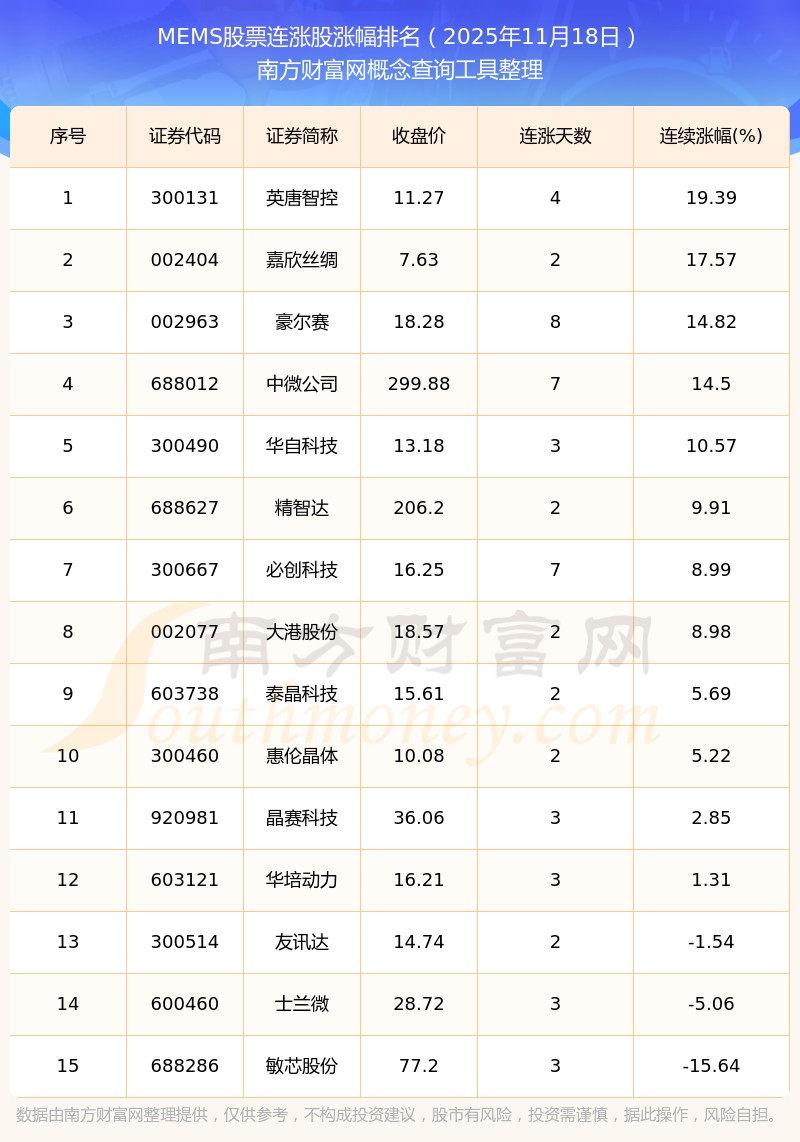 根據(jù)南方財(cái)富網(wǎng)概念查詢工具數(shù)據(jù)統(tǒng)計(jì),截止2025年11月18日收盤,MEMS股票共有15只個(gè)股實(shí)現(xiàn)連漲。其中連續(xù)漲幅較大的個(gè)股有英唐智控、嘉欣絲綢、豪爾賽等,連續(xù)漲幅分別為19.39%、17.57%、14.82%。