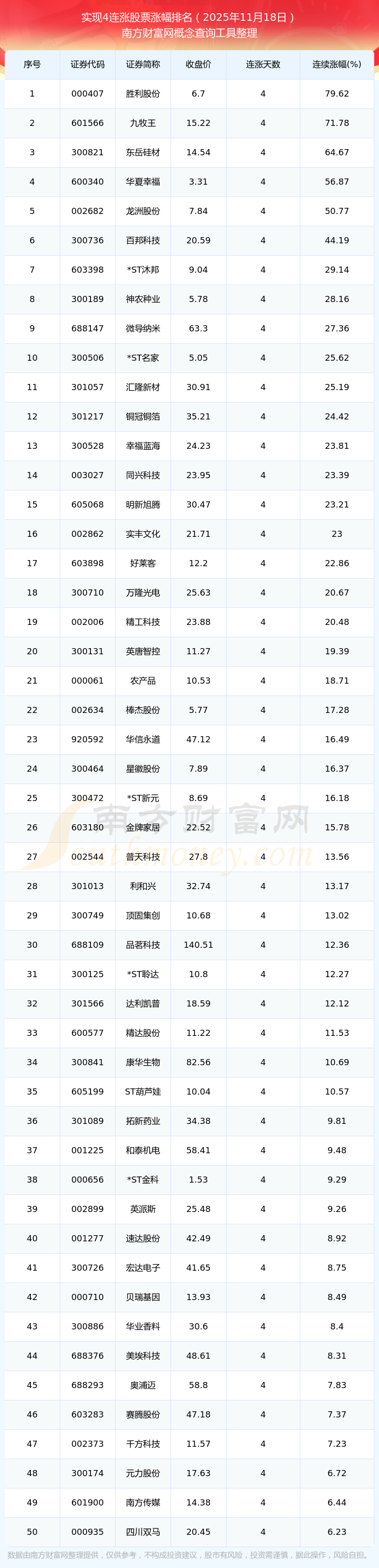 2025年11月18日實現(xiàn)4連漲股票漲幅排名