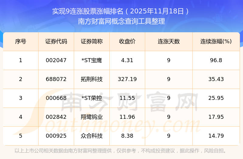 根據(jù)南方財富網(wǎng)概念查詢工具數(shù)據(jù)統(tǒng)計,截止2025年11月18日收盤,共有5只個股實現(xiàn)9天連漲。其中連續(xù)漲幅較大的個股有*ST寶鷹、拓荊科技、*ST榮控等,連續(xù)漲幅分別為96.80%、35.43%、25.95%。