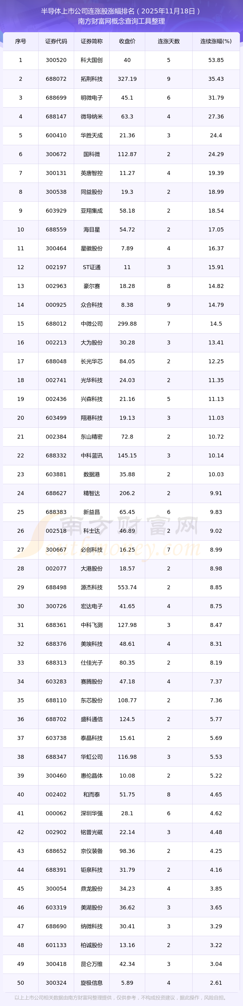 2025年11月18日半導(dǎo)體上市公司連漲股票漲幅排名