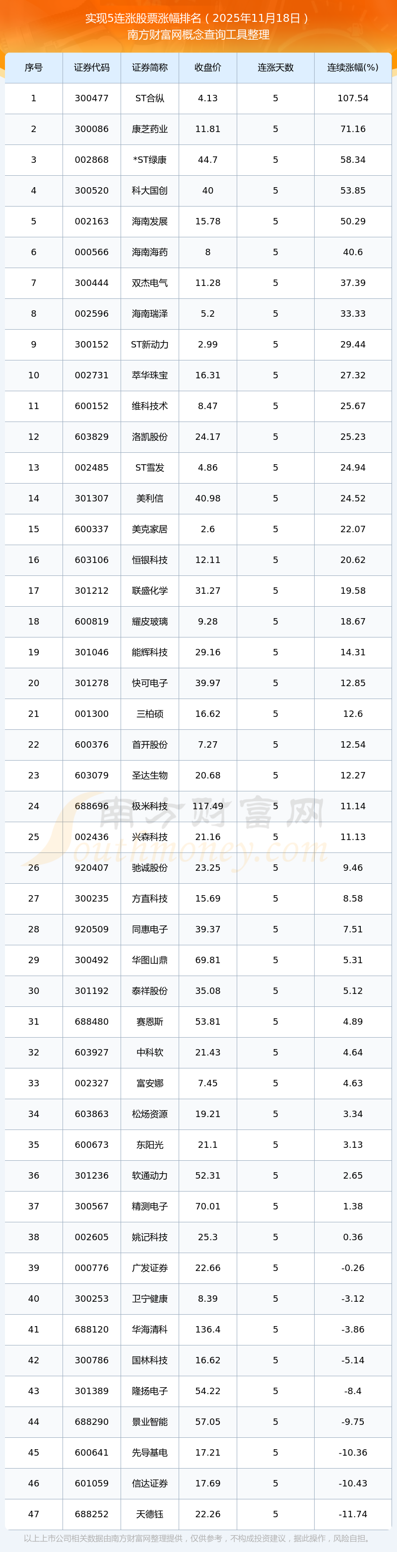 根據(jù)南方財(cái)富網(wǎng)概念查詢工具數(shù)據(jù)統(tǒng)計(jì),截止2025年11月18日收盤,共有47只個(gè)股實(shí)現(xiàn)5天連漲。其中連續(xù)漲幅較大的個(gè)股有ST合縱、康芝藥業(yè)、*ST綠康等,連續(xù)漲幅分別為107.54%、71.16%、58.34%。
