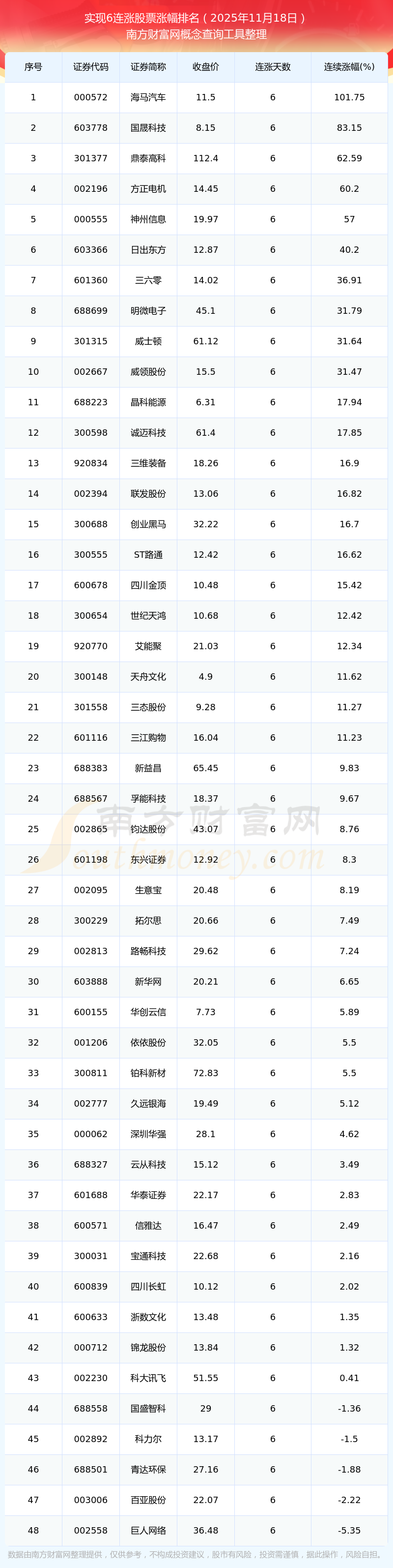 根據(jù)南方財富網(wǎng)概念查詢工具數(shù)據(jù)統(tǒng)計,截止2025年11月18日收盤,共有48只個股實現(xiàn)6天連漲。其中連續(xù)漲幅較大的個股有海馬汽車、國晟科技、鼎泰高科等,連續(xù)漲幅分別為101.75%、83.15%、62.59%。