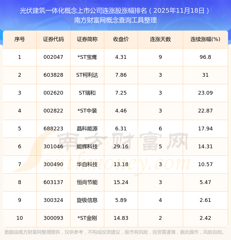 2025年11月18日光伏建筑一體化概念上市公司連漲股漲幅排名
