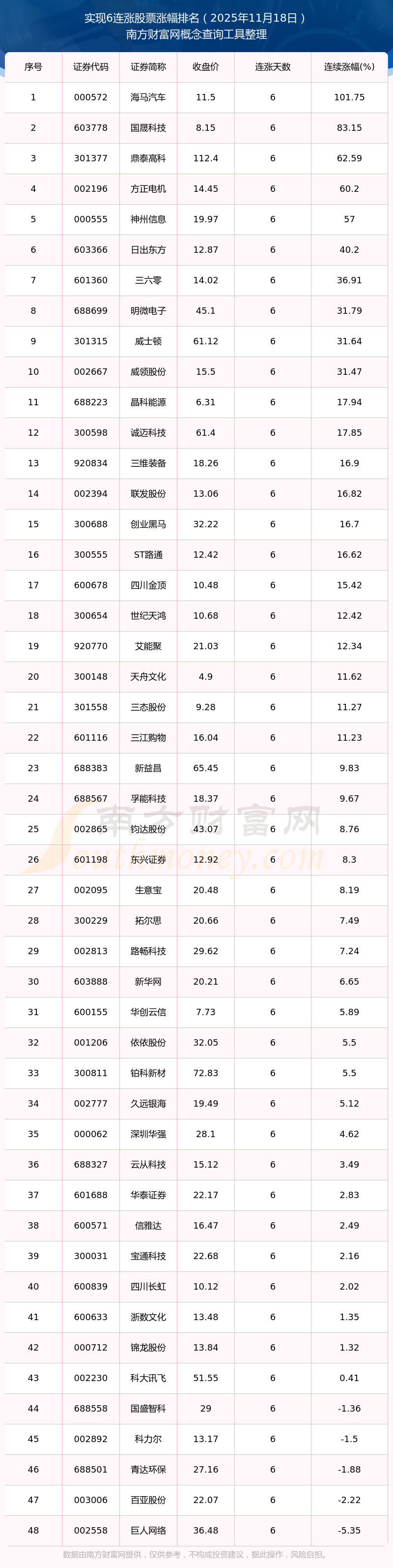 根據(jù)南方財(cái)富網(wǎng)概念查詢工具數(shù)據(jù)統(tǒng)計(jì),截止2025年11月18日收盤(pán),共有48只個(gè)股實(shí)現(xiàn)6天連漲。其中連續(xù)漲幅較大的個(gè)股有海馬汽車、國(guó)晟科技、鼎泰高科等,連續(xù)漲幅分別為101.75%、83.15%、62.59%。