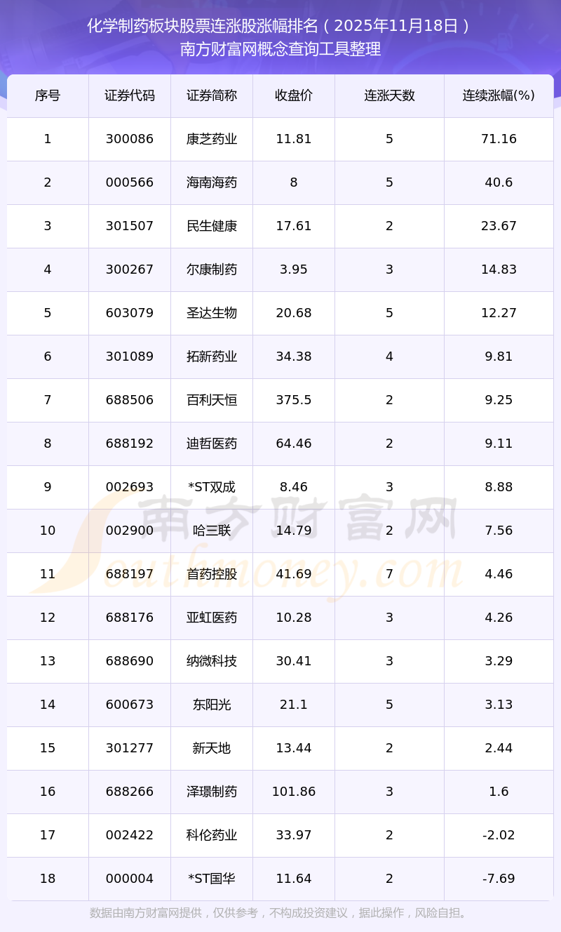 2025年11月18日化學(xué)制藥板塊股票連漲股漲幅排名