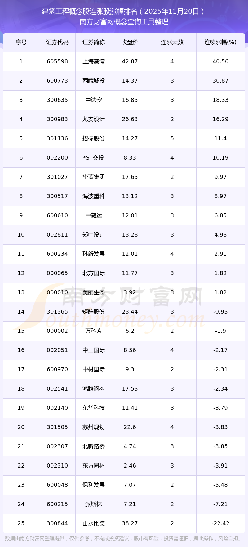 根據(jù)南方財富網(wǎng)概念查詢工具數(shù)據(jù)統(tǒng)計,截止2025年11月20日收盤,建筑工程概念股共有25只個股實現(xiàn)連漲。其中連續(xù)漲幅較大的個股有上海港灣、西藏城投、中達安等,連續(xù)漲幅分別為40.56%、30.87%、18.33%。