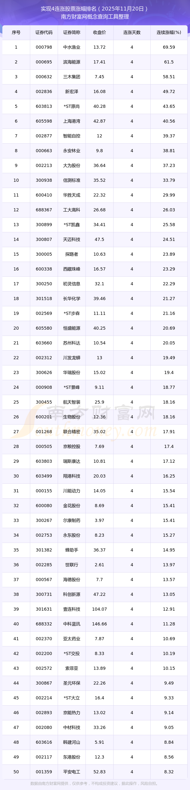 2025年11月20日實現(xiàn)4連漲股票漲幅排名