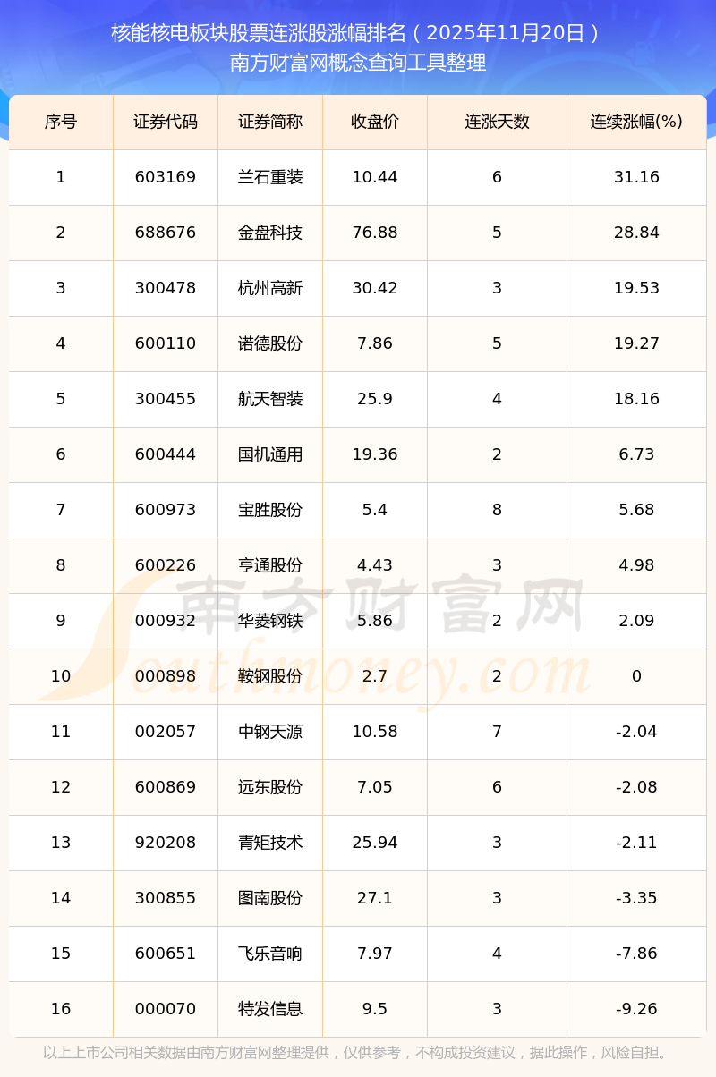 2025年11月20日核能核電板塊股票連漲股漲幅排名
