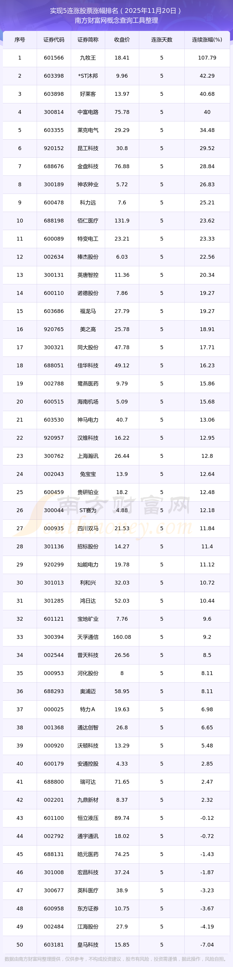 2025年11月20日連漲5天的股票漲幅排名