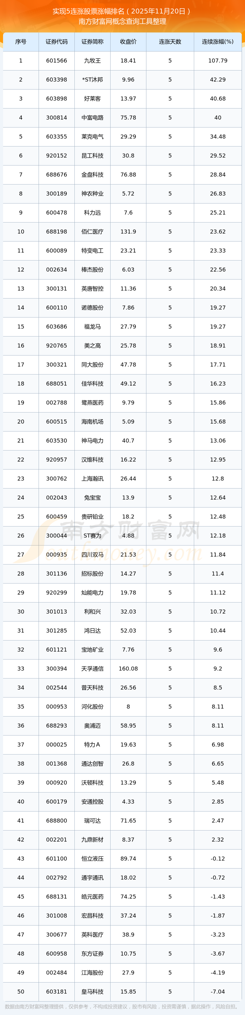 2025年11月20日實(shí)現(xiàn)5連漲股票漲幅排名