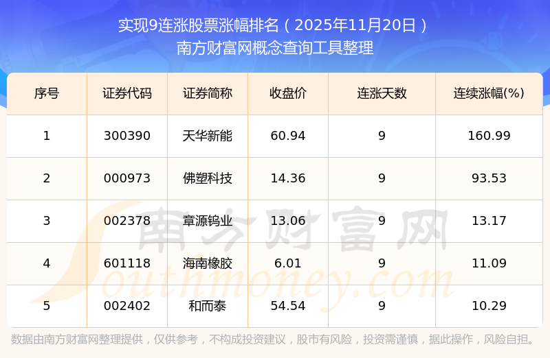2025年11月20日實(shí)現(xiàn)9連漲股票漲幅排名