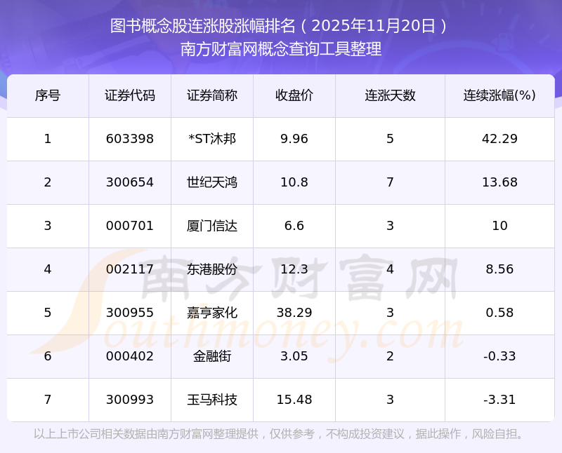 根據(jù)南方財富網(wǎng)概念查詢工具數(shù)據(jù)統(tǒng)計,截止2025年11月20日收盤,圖書概念股共有7只個股實現(xiàn)連漲。其中連續(xù)漲幅較大的個股有*ST沐邦、世紀天鴻、廈門信達等,連續(xù)漲幅分別為42.29%、13.68%、10.00%。