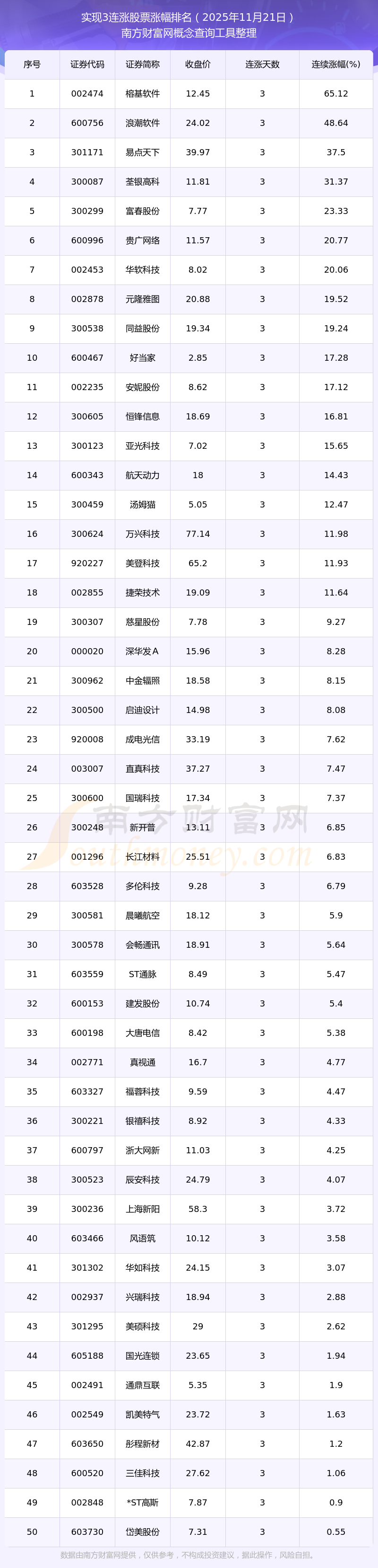 根據(jù)南方財富網(wǎng)概念查詢工具數(shù)據(jù)統(tǒng)計,截止2025年11月21日收盤,共有75只個股實現(xiàn)3天連漲。其中連續(xù)漲幅較大的個股有榕基軟件、浪潮軟件、易點天下等,連續(xù)漲幅分別為65.12%、48.64%、37.50%。