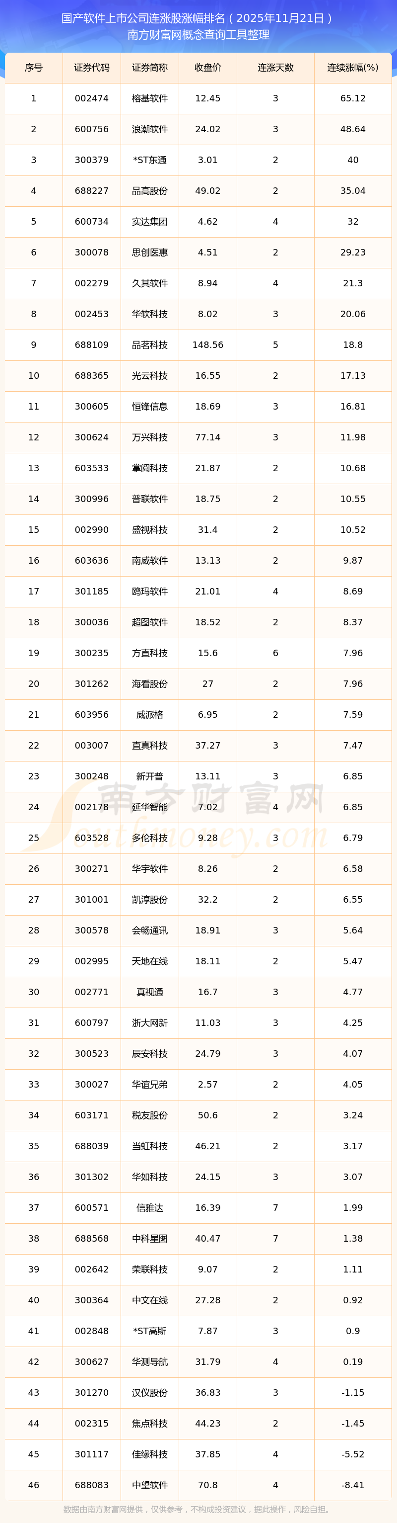 2025年11月21日國(guó)產(chǎn)軟件上市公司連漲股漲幅排名