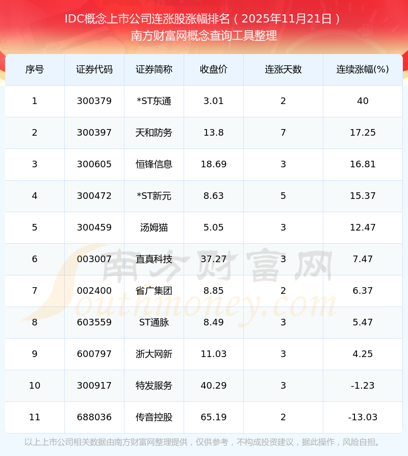 2025年11月21日IDC概念上市公司連漲股漲幅排名
