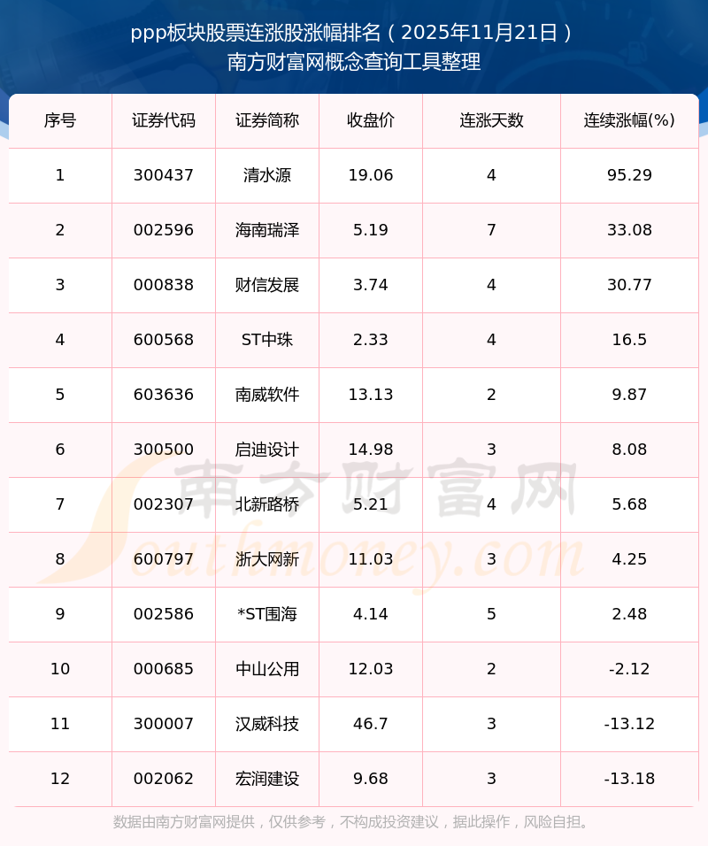 2025年11月21日ppp板塊股票連漲股漲幅排名