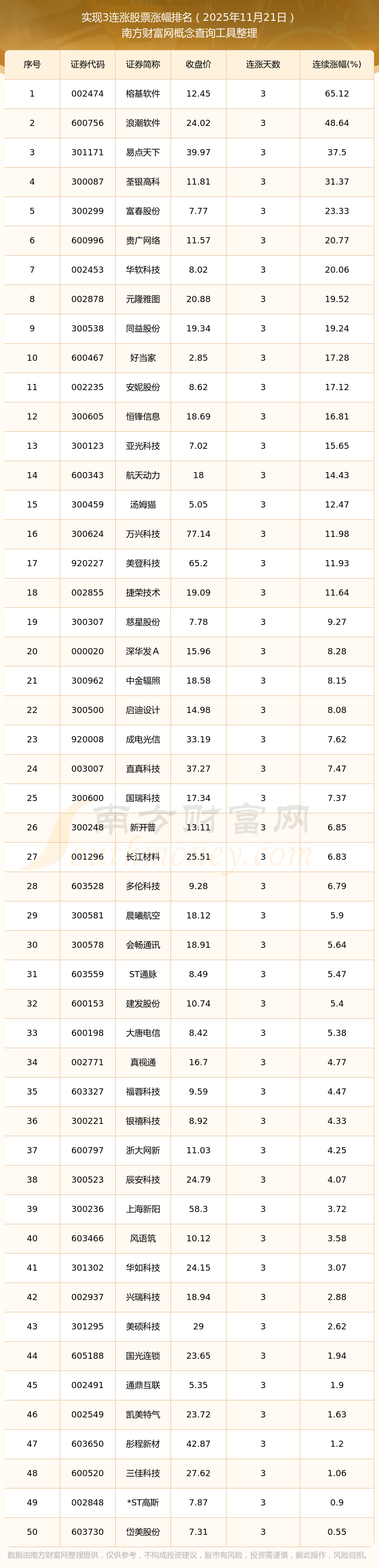 2025年11月21日實現(xiàn)3連漲股票漲幅排名