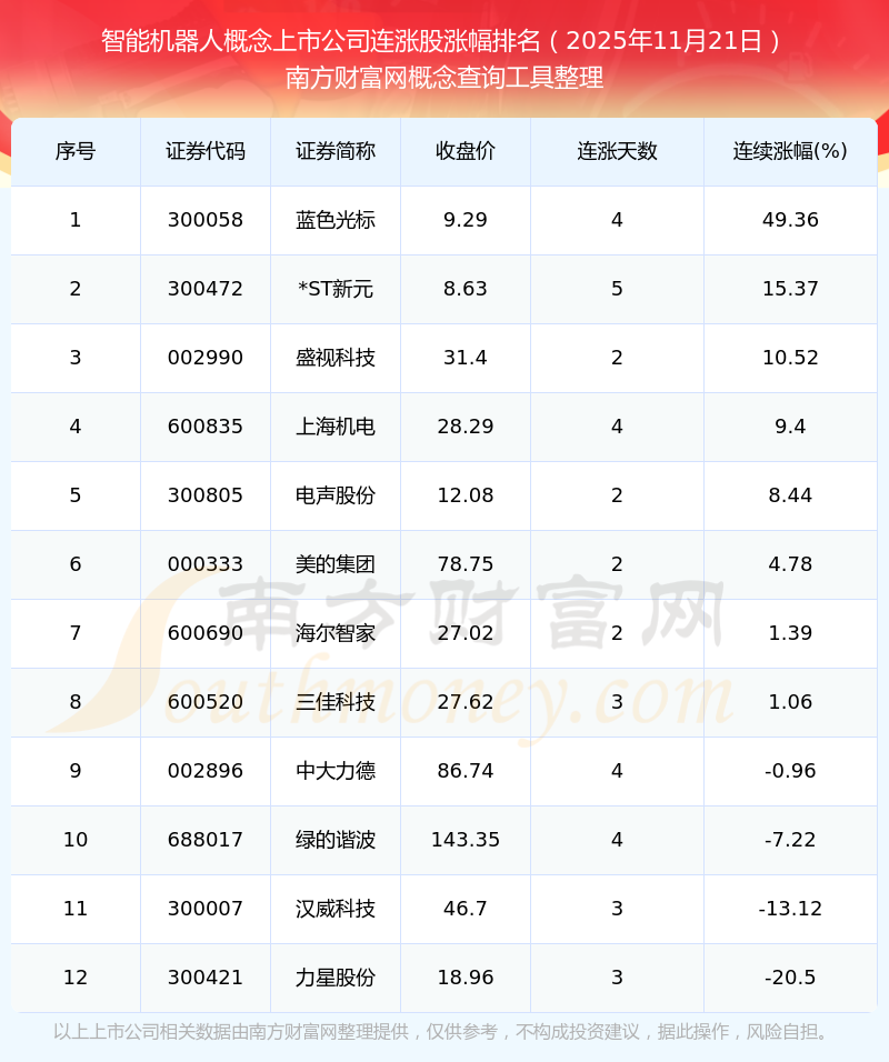 根據(jù)南方財(cái)富網(wǎng)概念查詢工具數(shù)據(jù)統(tǒng)計(jì),截止2025年11月21日收盤,智能機(jī)器人概念上市公司共有12只個(gè)股實(shí)現(xiàn)連漲。其中連續(xù)漲幅較大的個(gè)股有藍(lán)色光標(biāo)、*ST新元、盛視科技等,連續(xù)漲幅分別為49.36%、15.37%、10.52%。