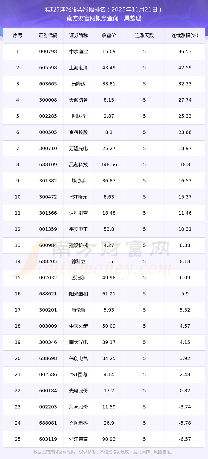 根據(jù)南方財(cái)富網(wǎng)概念查詢工具數(shù)據(jù)統(tǒng)計(jì),截止2025年11月21日收盤,共有25只個(gè)股實(shí)現(xiàn)5天連漲。其中連續(xù)漲幅較大的個(gè)股有中水漁業(yè)、上海港灣、康隆達(dá)等,連續(xù)漲幅分別為86.53%、42.59%、32.33%。