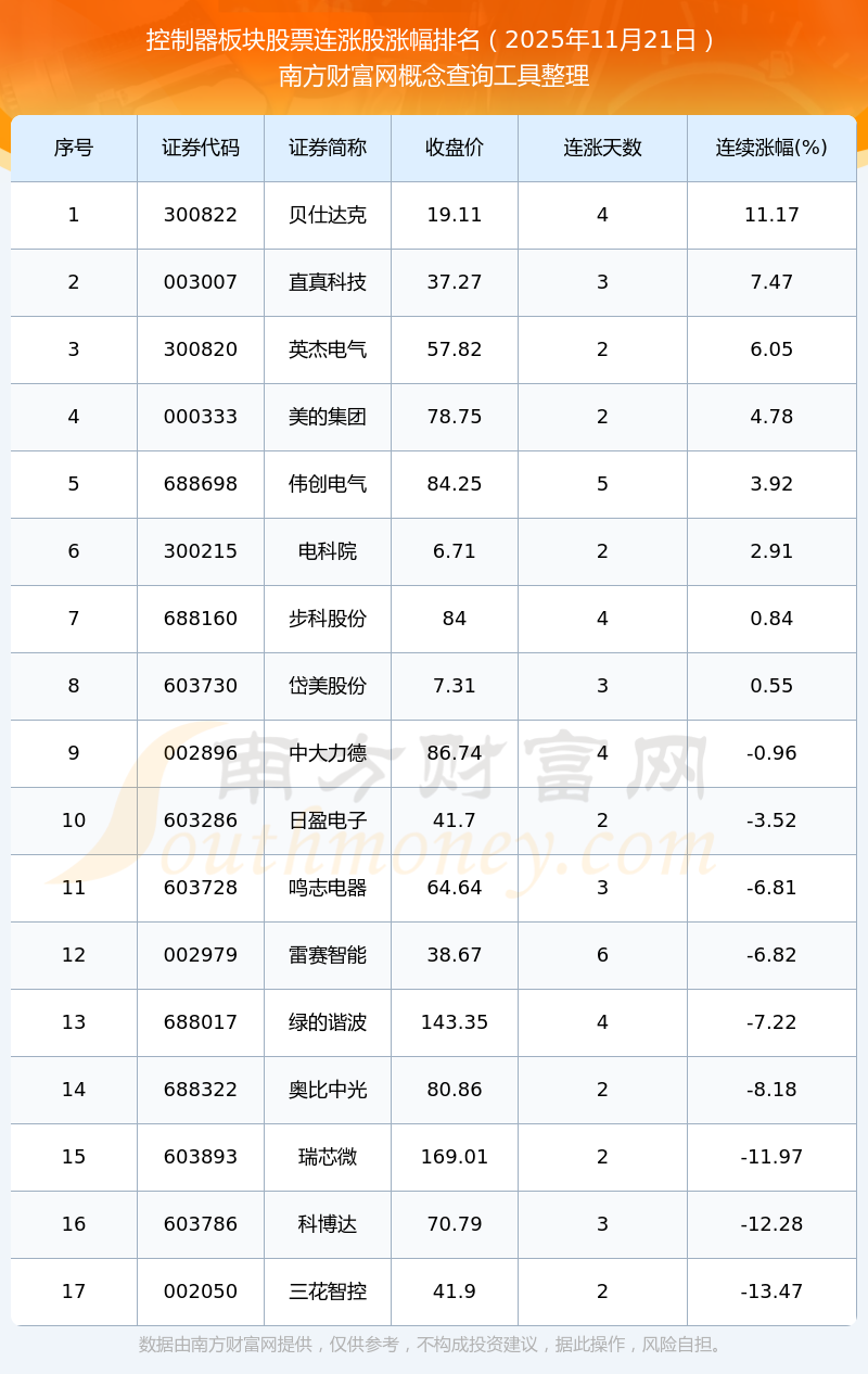 2025年11月21日控制器板塊股票連漲股漲幅排名