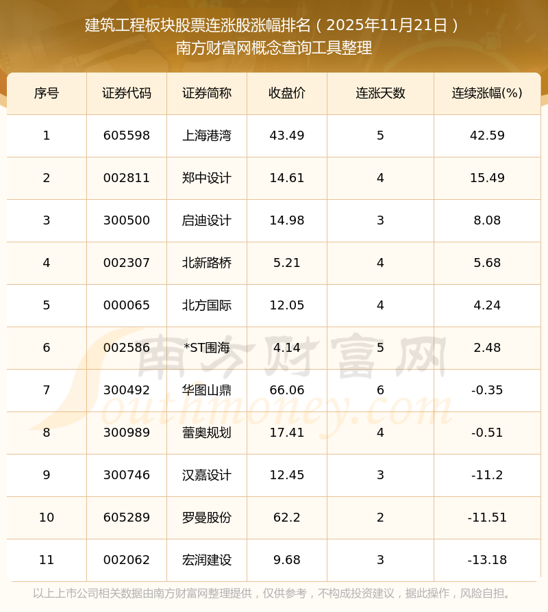 根據(jù)南方財(cái)富網(wǎng)概念查詢工具數(shù)據(jù)統(tǒng)計(jì),截止2025年11月21日收盤,建筑工程板塊股票共有11只個(gè)股實(shí)現(xiàn)連漲。其中連續(xù)漲幅較大的個(gè)股有上海港灣、鄭中設(shè)計(jì)、啟迪設(shè)計(jì)等,連續(xù)漲幅分別為42.59%、15.49%、8.08%。