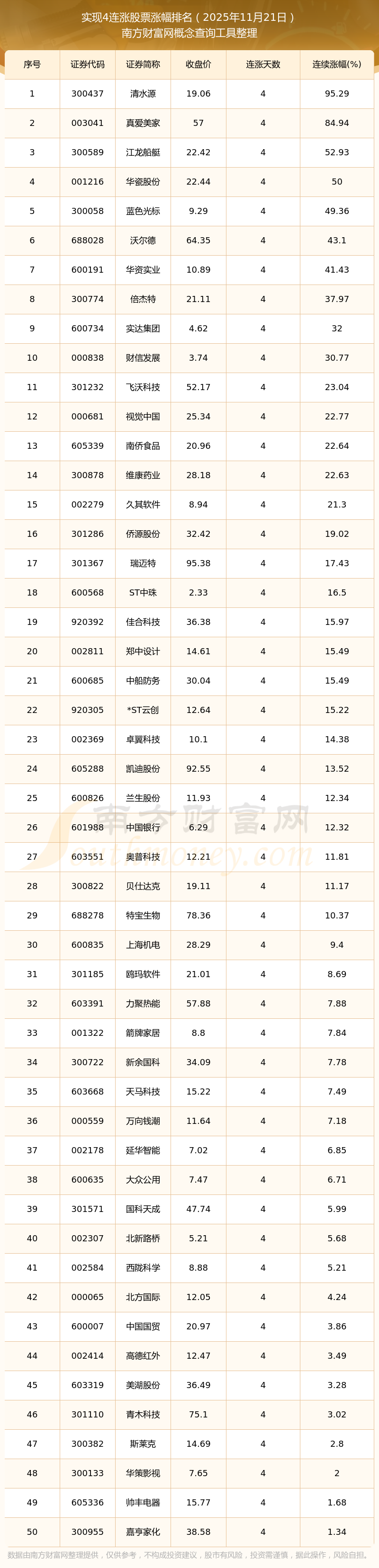 2025年11月21日實(shí)現(xiàn)4連漲股票漲幅排名