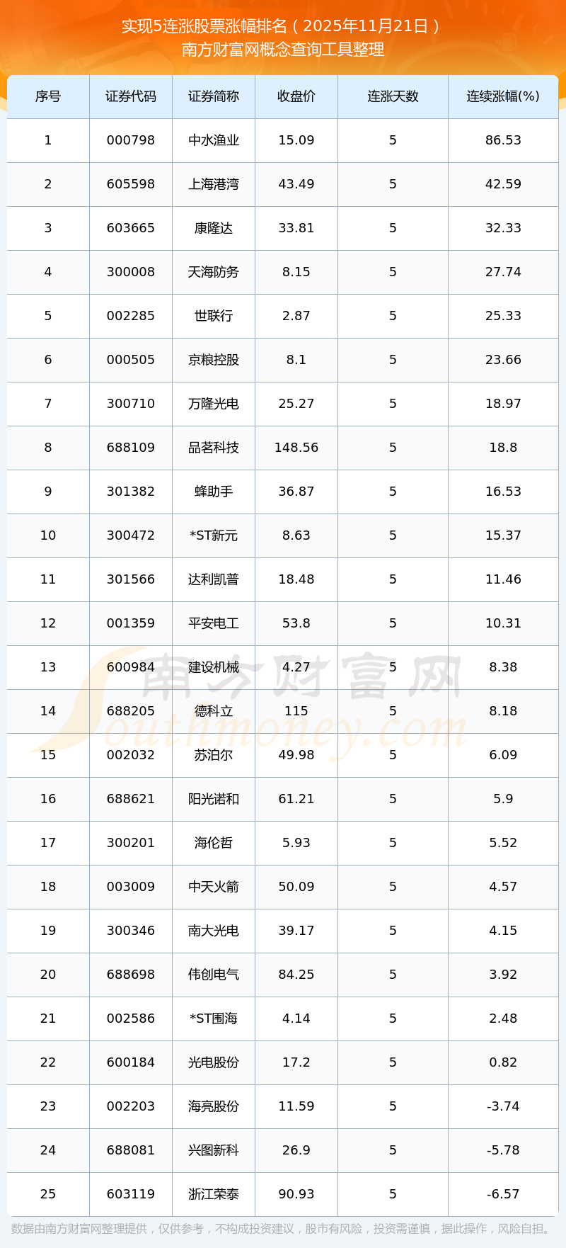 根據(jù)南方財(cái)富網(wǎng)概念查詢工具數(shù)據(jù)統(tǒng)計(jì),截止2025年11月21日收盤,共有25只個(gè)股實(shí)現(xiàn)5天連漲。其中連續(xù)漲幅較大的個(gè)股有中水漁業(yè)、上海港灣、康隆達(dá)等,連續(xù)漲幅分別為86.53%、42.59%、32.33%。
