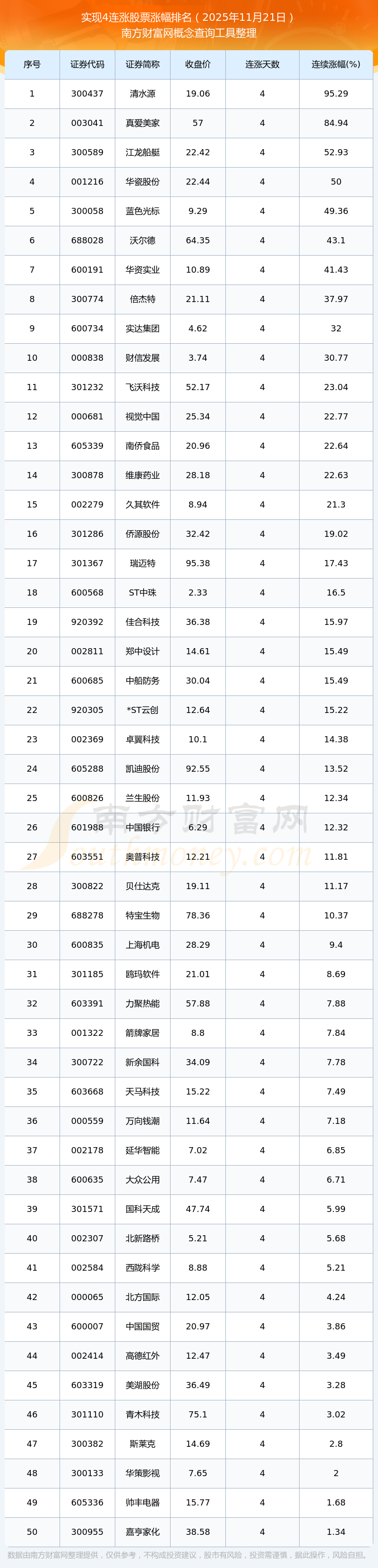2025年11月21日實(shí)現(xiàn)4連漲股票漲幅排名
