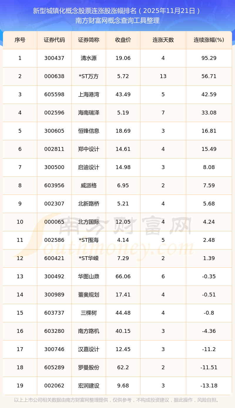 2025年11月21日新型城鎮(zhèn)化概念股票連漲股漲幅排名