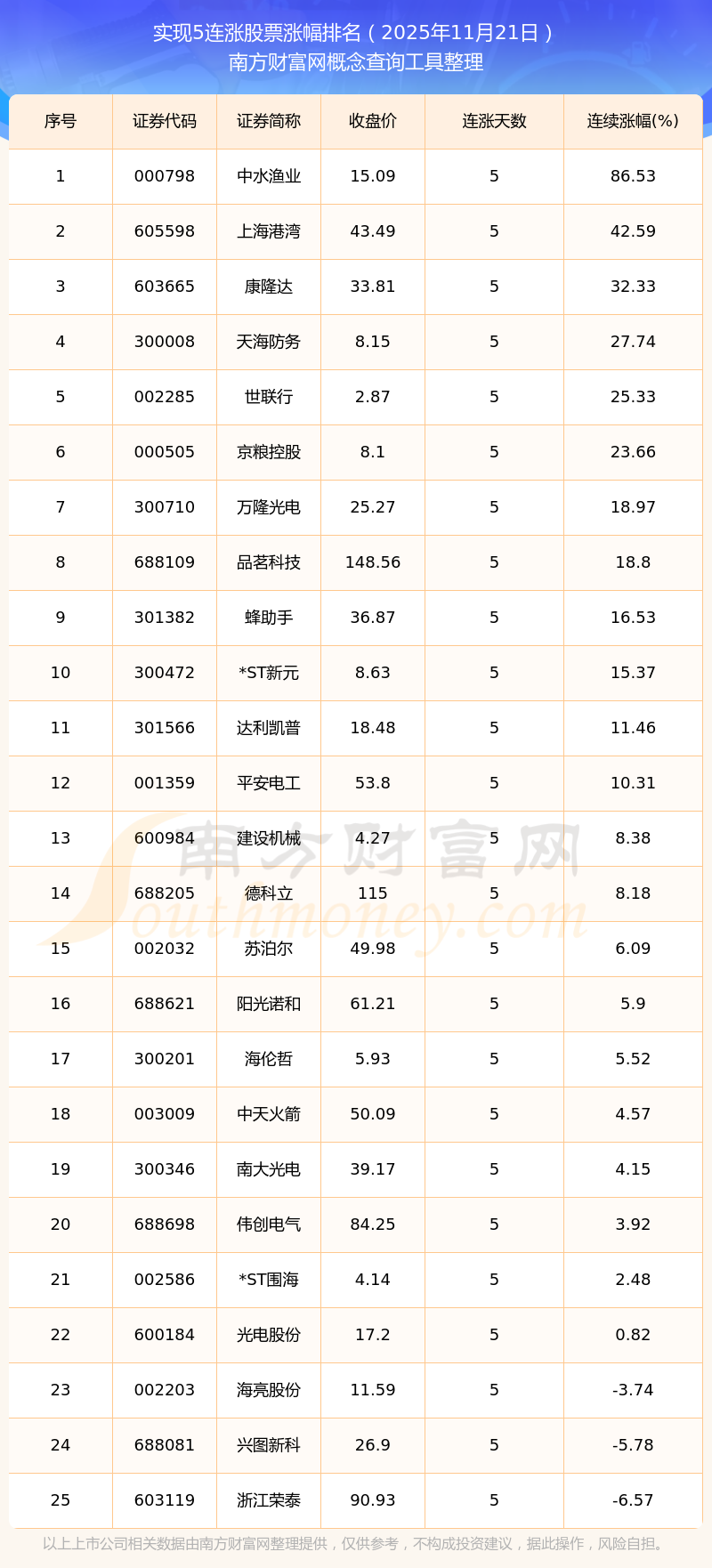 根據南方財富網概念查詢工具數據統(tǒng)計,截止2025年11月21日收盤,共有25只個股實現5天連漲。其中連續(xù)漲幅較大的個股有中水漁業(yè)、上海港灣、康隆達等,連續(xù)漲幅分別為86.53%、42.59%、32.33%。