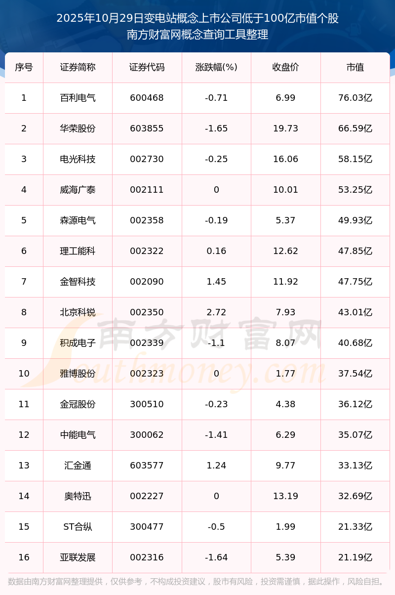 截止2025年10月29日,變電站概念上市公司市值低于100億的個(gè)股共有16只。其中,市值較高的有百利電氣、華榮股份、電光科技,市值分別為76.03億元、66.59億元、58.15億元。