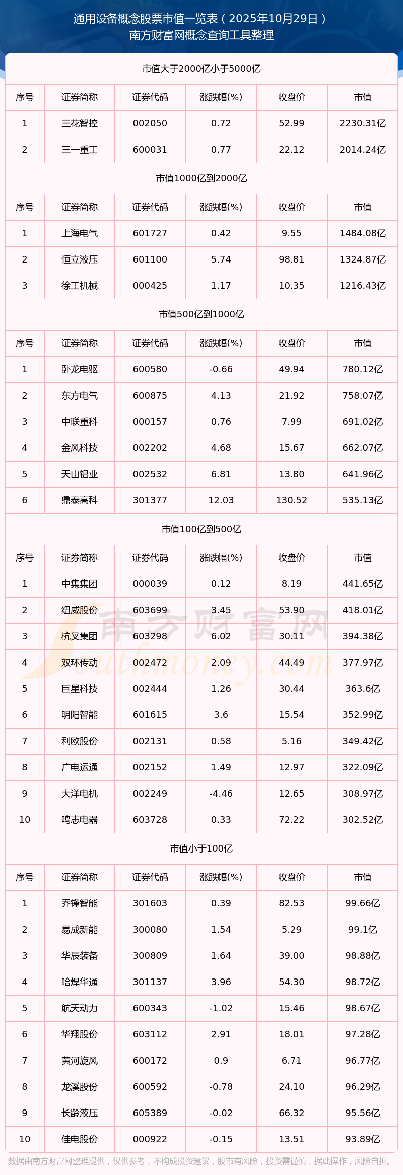 截止2025年10月29日,通用設(shè)備概念股票中黃河旋風(fēng)、易成新能、航天動力等330家市值位于不足100億之列;中集集團、紐威股份、杭叉集團、雙環(huán)傳動、明陽智能等80家市值位于100億到500億之列;臥龍電驅(qū)、東方電氣、中聯(lián)重科、金風(fēng)科技、天山鋁業(yè)等6家市值位于500億到1000億之列;上海電氣、恒立液壓、徐工機械等3家市值位于1000億到2000億之列;三花智控和三一重工市值位于2000億到5000億之列。