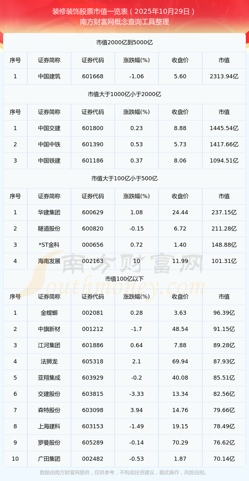 截止2025年10月29日,裝修裝飾股票中金螳螂、中旗新材、江河集團(tuán)等52家市值位于不足100億之列;華建集團(tuán)、隧道股份、*ST金科、海南發(fā)展等4家市值位于100億到500億之列;中國交建、中國中鐵、中國鐵建等3家市值位于1000億到2000億之列;中國建筑市值位于2000億到5000億之列。