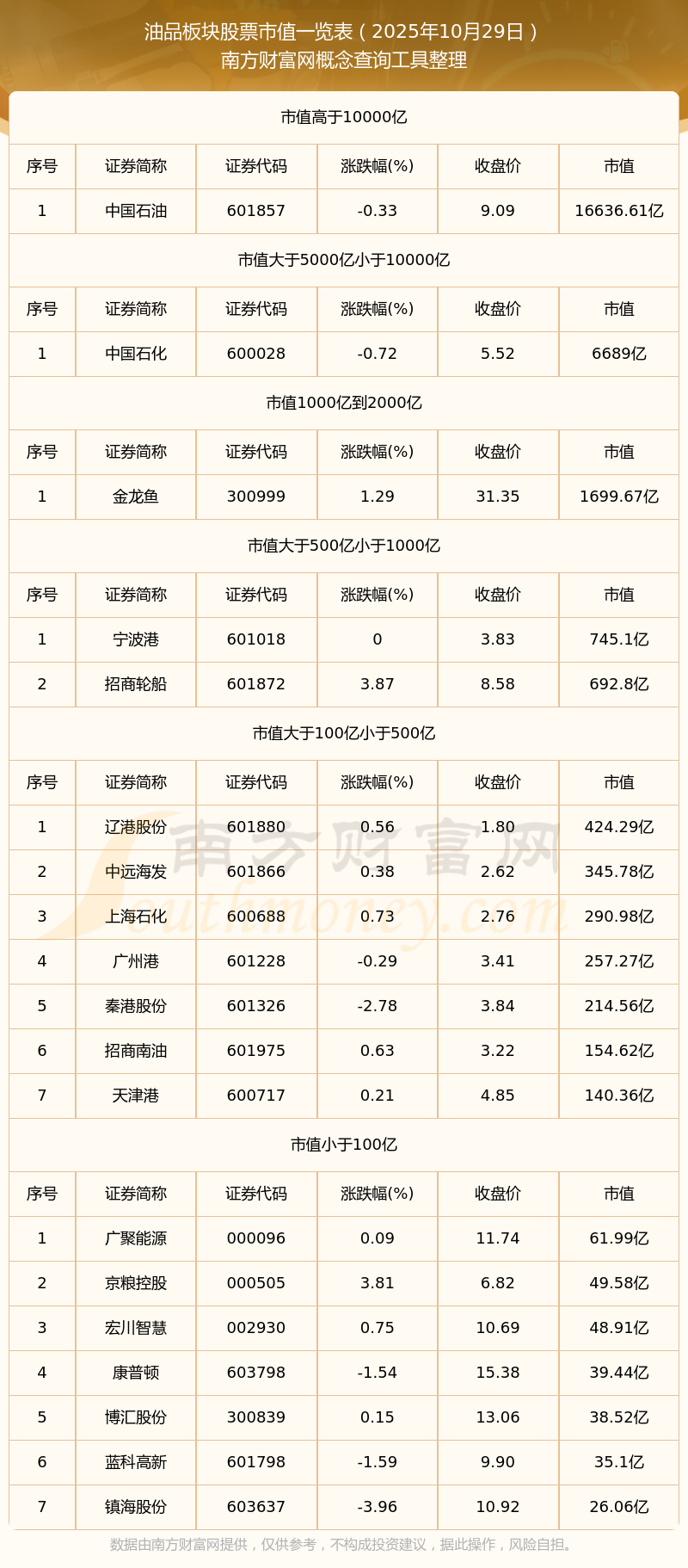 截止2025年10月29日,油品板塊股票中廣聚能源、京糧控股、宏川智慧、康普頓等7家市值位于不足100億之列;遼港股份、中遠海發(fā)、上海石化、廣州港等7家市值位于100億到500億之列;招商輪船和寧波港市值位于500億到1000億之列;金龍魚市值位于1000億到2000億之列;中國石化市值位于5000億到10000億之列;中國石油市值位于大于10000億之列。