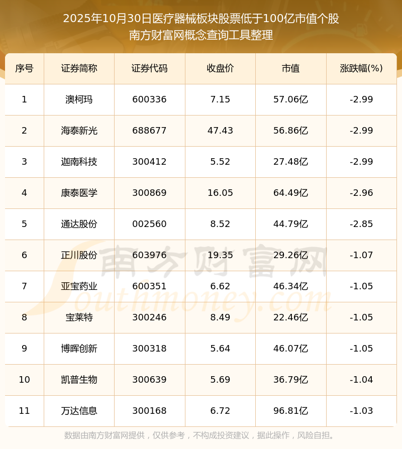 截止2025年10月30日,醫(yī)療器械板塊股票市值低于100億的個股共有11只。其中,市值較高的有萬達(dá)信息、康泰醫(yī)學(xué)、澳柯瑪,市值分別為96.81億元、64.49億元、57.06億元。