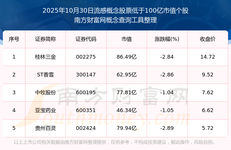 截止2025年10月30日,流感概念股票市值低于100億的個股共有5只。其中,市值較高的有桂林三金、貴州百靈、中牧股份,市值分別為86.49億元、79.94億元、77.81億元。
