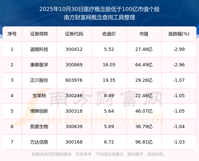 截止2025年10月30日,醫(yī)療概念股市值低于100億的個股共有7只。其中,市值較高的有萬達(dá)信息、康泰醫(yī)學(xué)、博暉創(chuàng)新,市值分別為96.81億元、64.49億元、46.07億元。