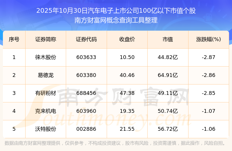 截止2025年10月30日,汽車(chē)電子上市公司市值100億以下的個(gè)股共有5只。其中,市值較高的有易德龍、沃特股份、克來(lái)機(jī)電,市值分別為64.91億元、56.72億元、50.74億元。