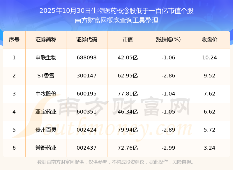 截止2025年10月30日,生物醫(yī)藥概念股市值低于一百億的個股共有6只。其中,市值較高的有貴州百靈、中牧股份、譽衡藥業(yè),市值分別為79.94億元、77.81億元、72.76億元。