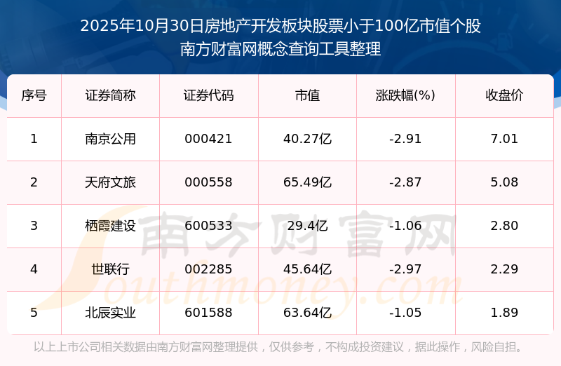 截止2025年10月30日,房地產開發(fā)板塊股票市值小于100億的個股共有5只。其中,市值較高的有天府文旅、北辰實業(yè)、世聯行,市值分別為65.49億元、63.64億元、45.64億元。