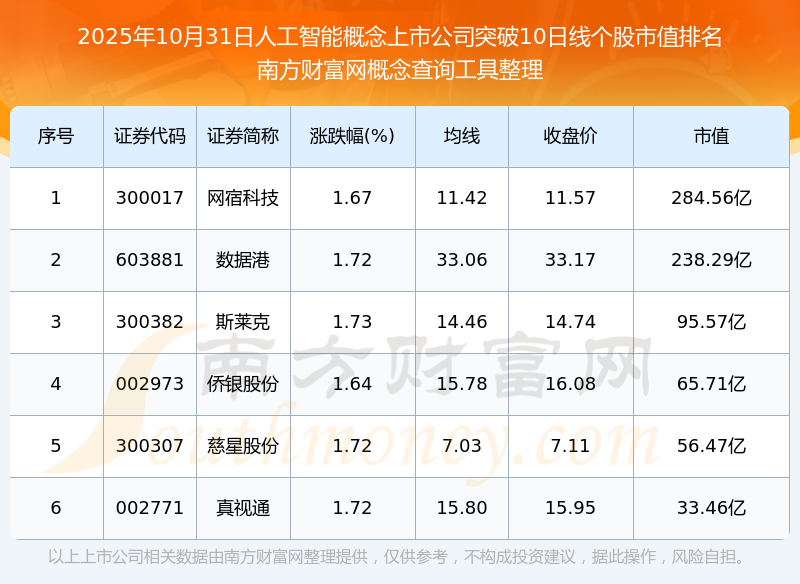 2025年10月31日人工智能概念上市公司突破10日線個(gè)股市值排名