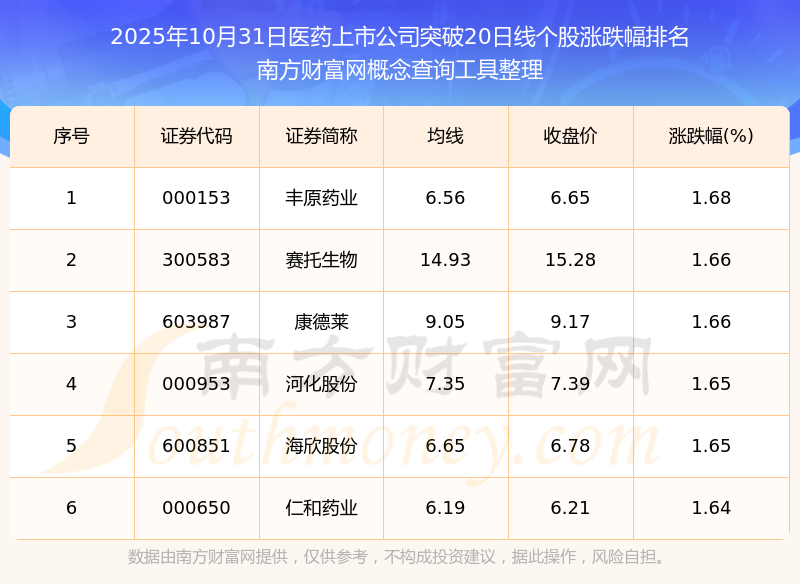 根據(jù)南方財富網(wǎng)概念查詢工具數(shù)據(jù)統(tǒng)計,截止2025年10月31日收盤,醫(yī)藥上市公司共有6只個股收盤價向上突破了20日線。其中漲幅較大的個股有豐原藥業(yè)、康德萊、賽托生物等,漲幅分別為1.68%、1.66%、1.66%。