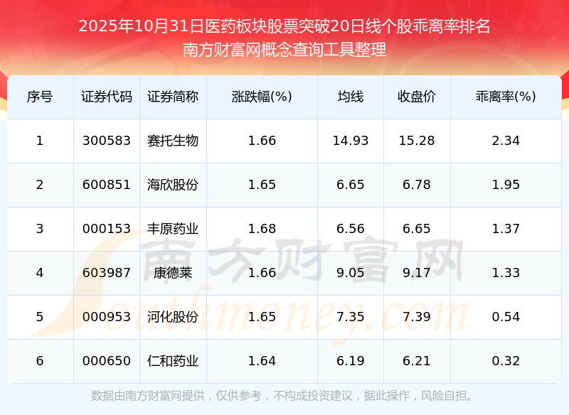 根據(jù)南方財(cái)富網(wǎng)概念查詢工具數(shù)據(jù)統(tǒng)計(jì),截止2025年10月31日收盤,醫(yī)藥板塊股票共有6只個(gè)股收盤價(jià)向上突破了20日線。其中乖離率較大的個(gè)股有賽托生物、海欣股份、豐原藥業(yè)等,乖離率分別為2.34%、1.95%、1.37%。
