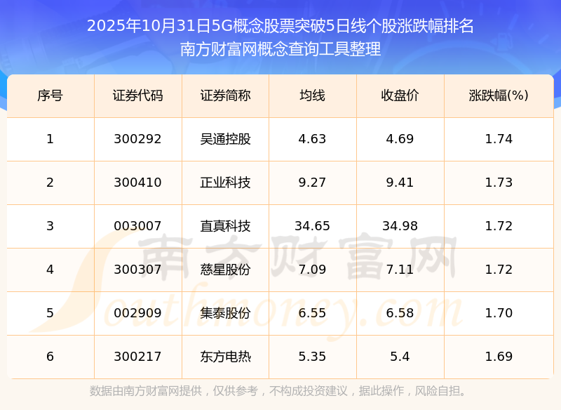 根據(jù)南方財富網(wǎng)概念查詢工具數(shù)據(jù)統(tǒng)計,截止2025年10月31日收盤,5G概念股票共有6只個股收盤價向上突破了5日線。其中漲幅較大的個股有吳通控股、正業(yè)科技、直真科技等,漲幅分別為1.74%、1.73%、1.72%。