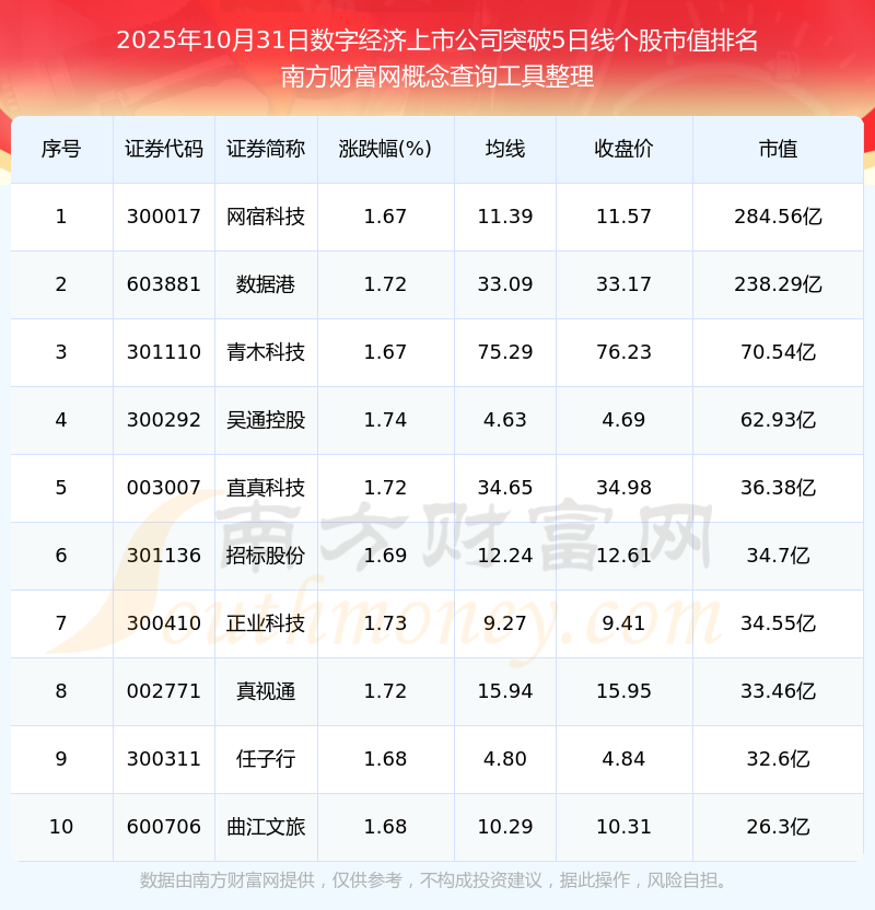 2025年10月31日數(shù)字經(jīng)濟(jì)上市公司突破5日線個(gè)股市值排名