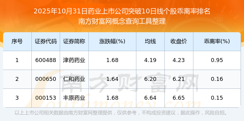 2025年10月31日藥業(yè)上市公司突破10日線個(gè)股乖離率排名